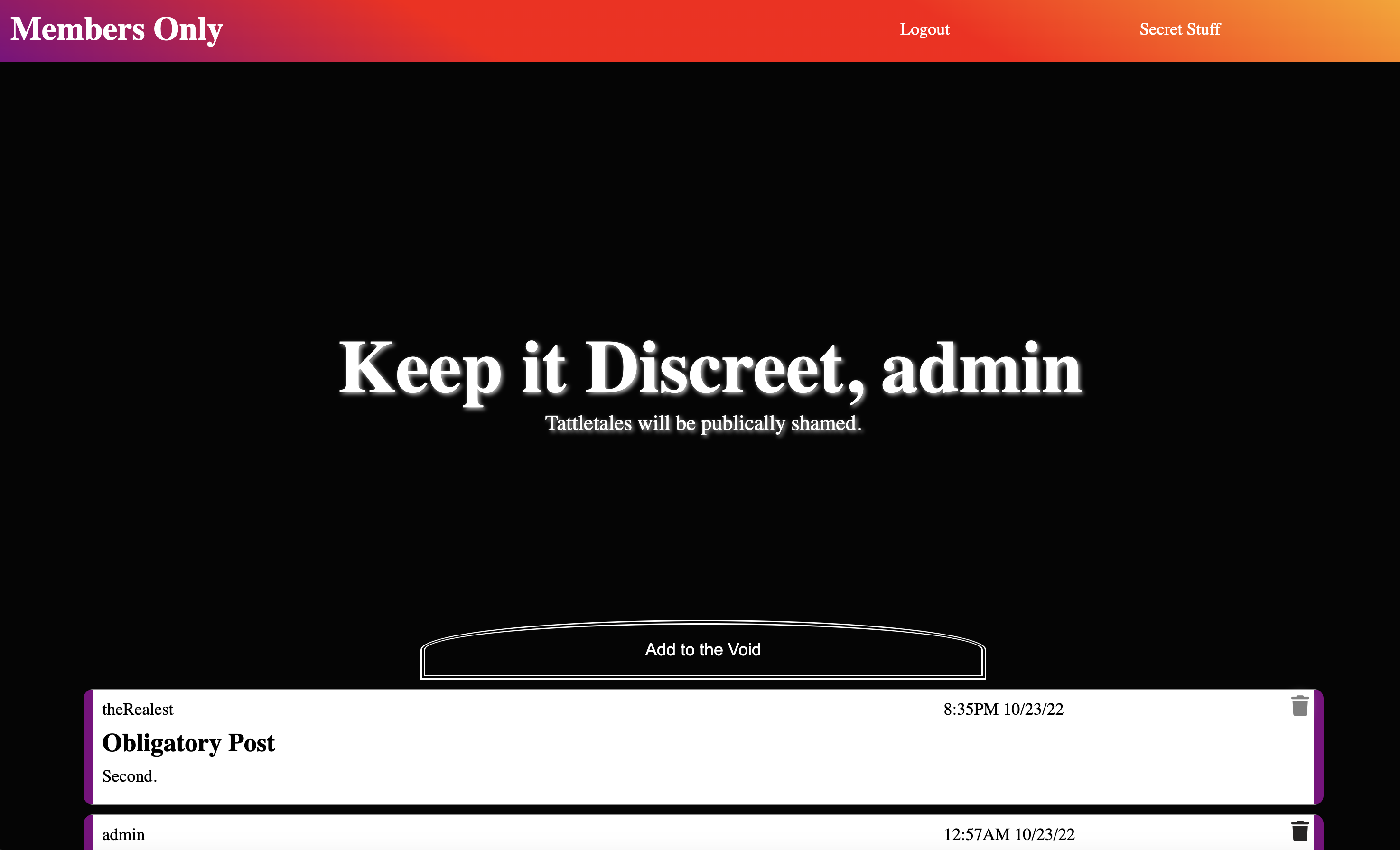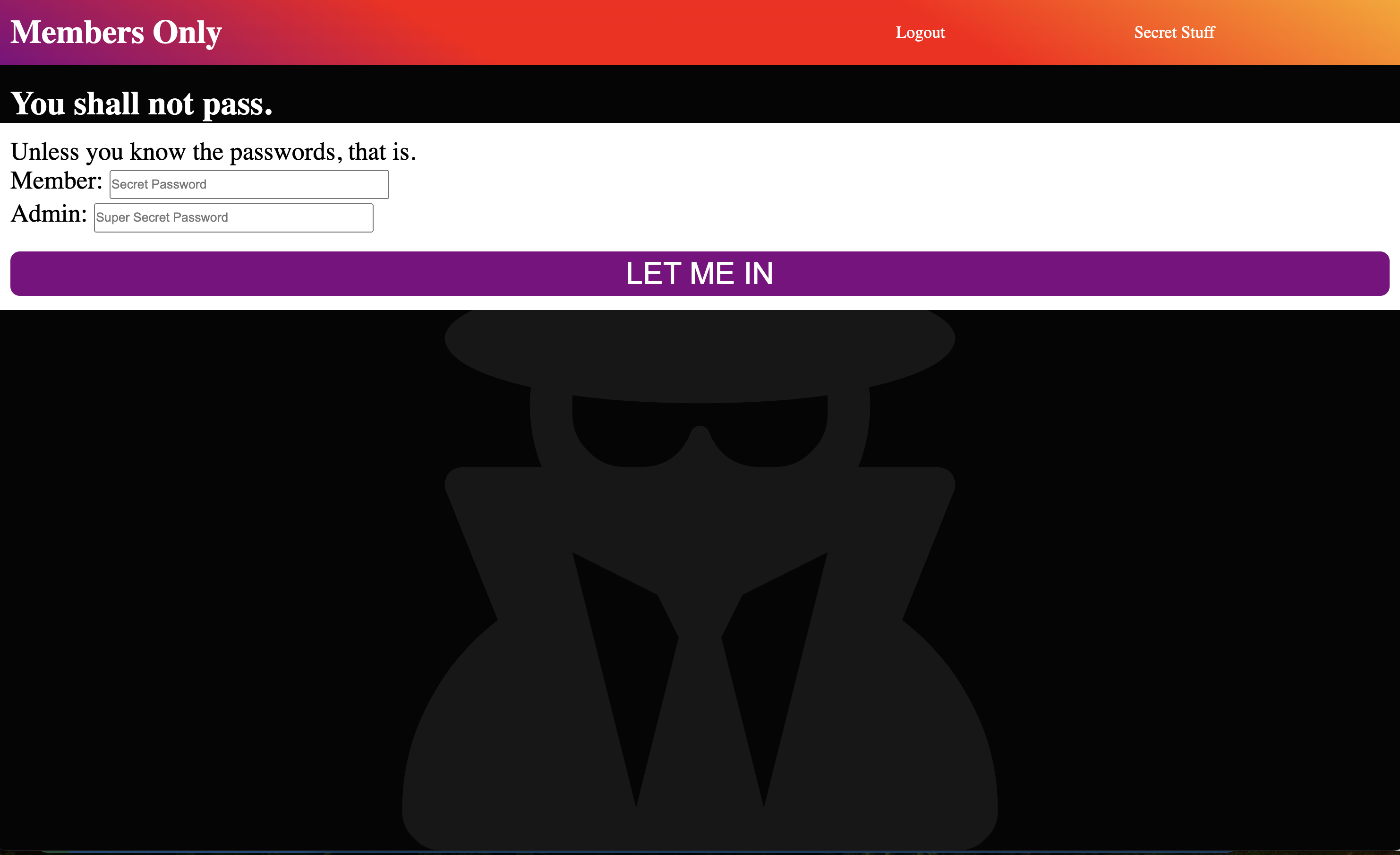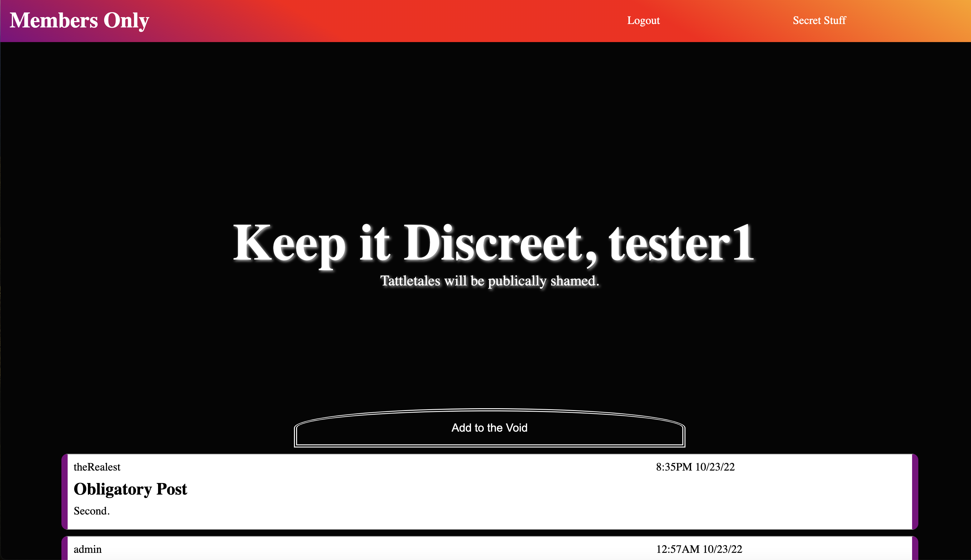 In order to practice user authentication, I set out to build an app that would change in functionality if the user is logged in and according to different authentication levels. To keep it simple, authentication levels are granted if the user enters a secret phrase on the appropriate page.