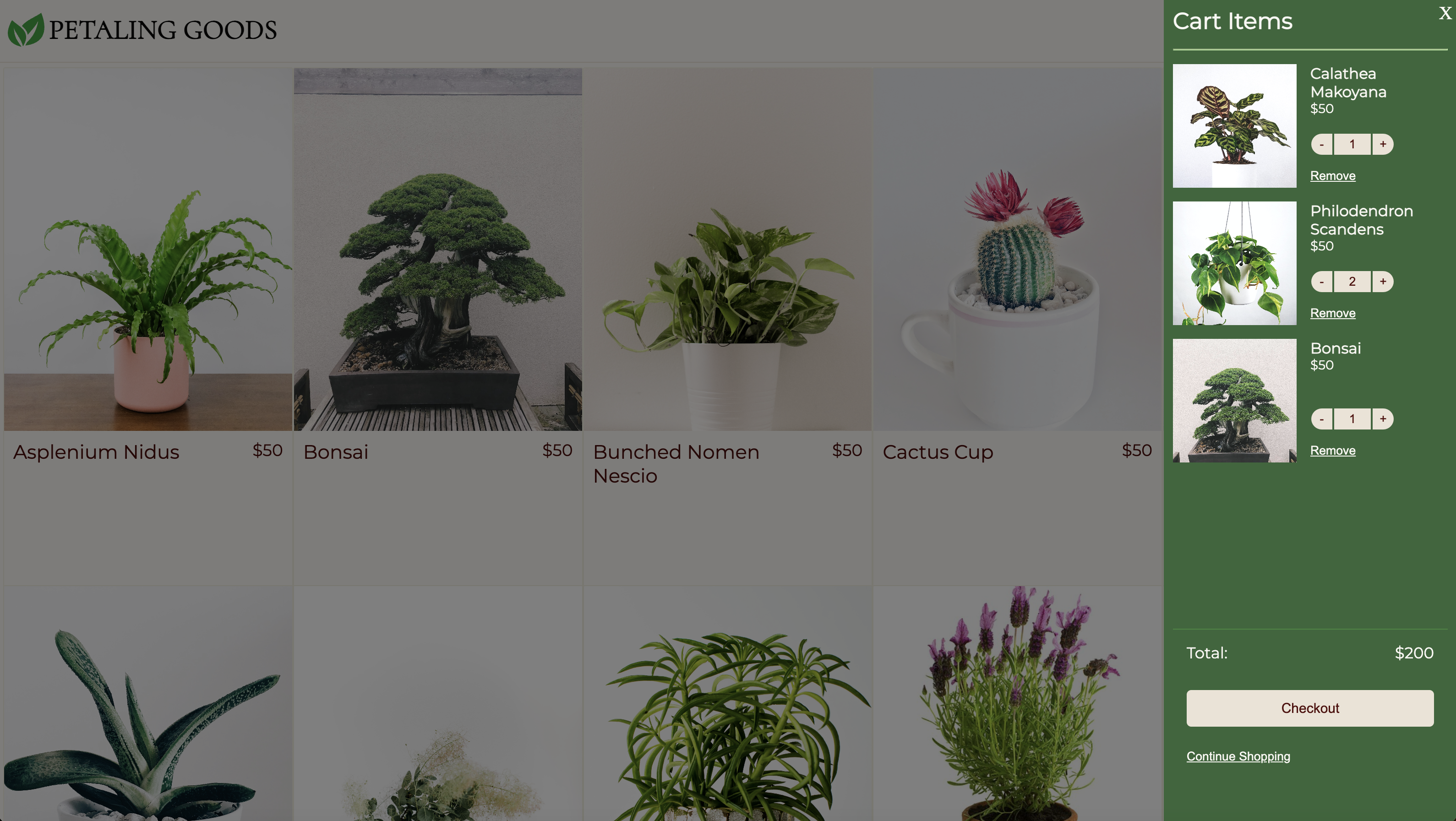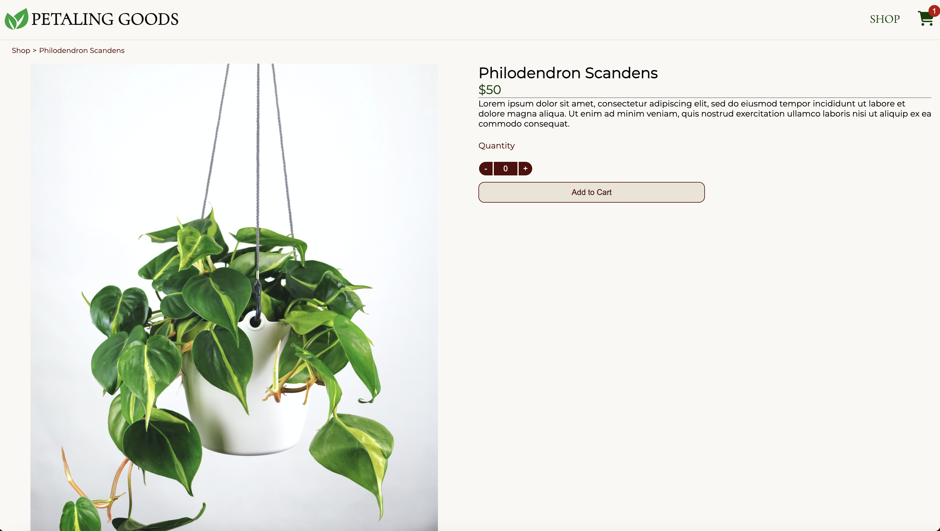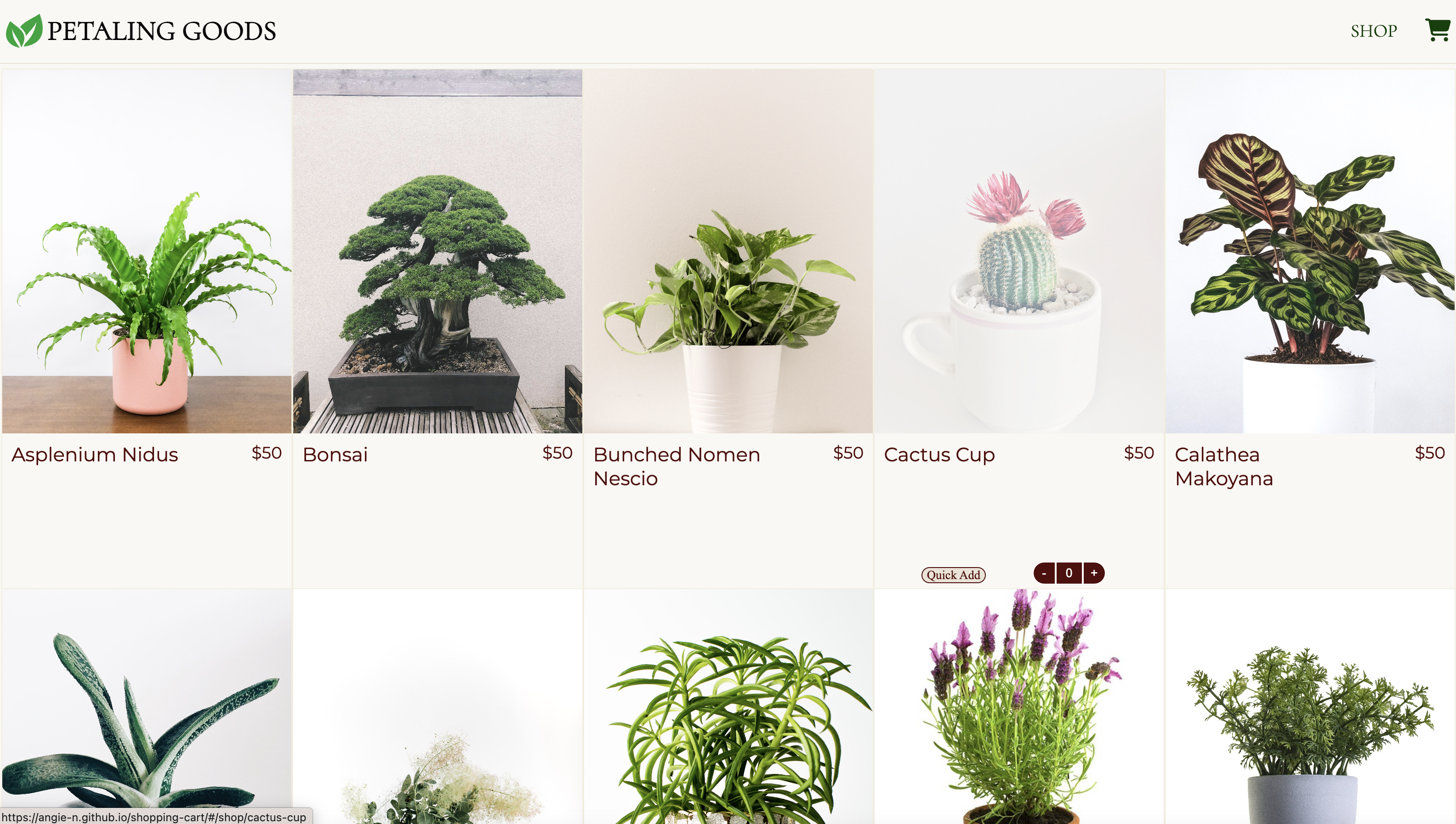 To practice React Routing, I developed a fake shop page for a plant business. Users are able to add various products to the cart, which are reflected in their count and charge.