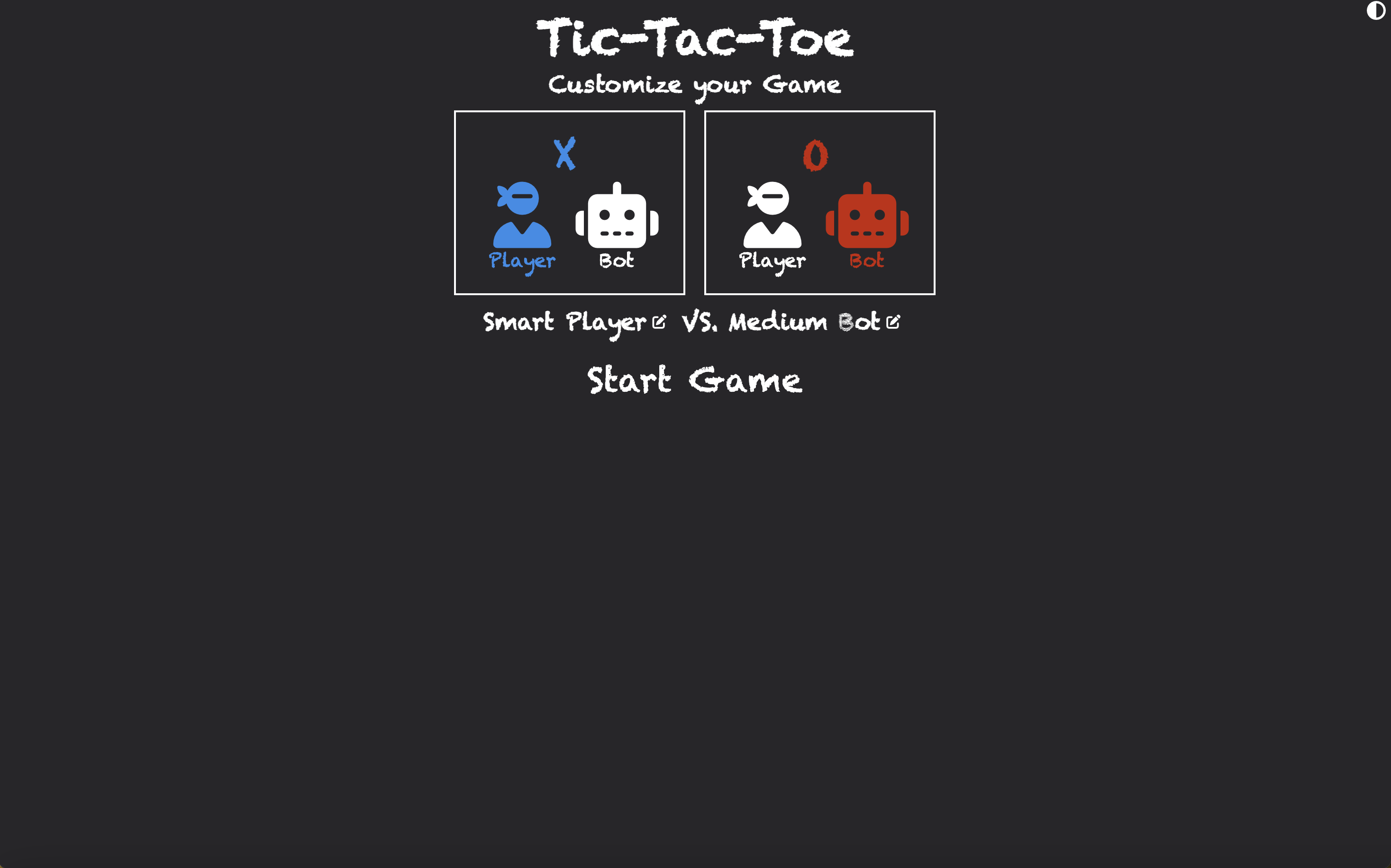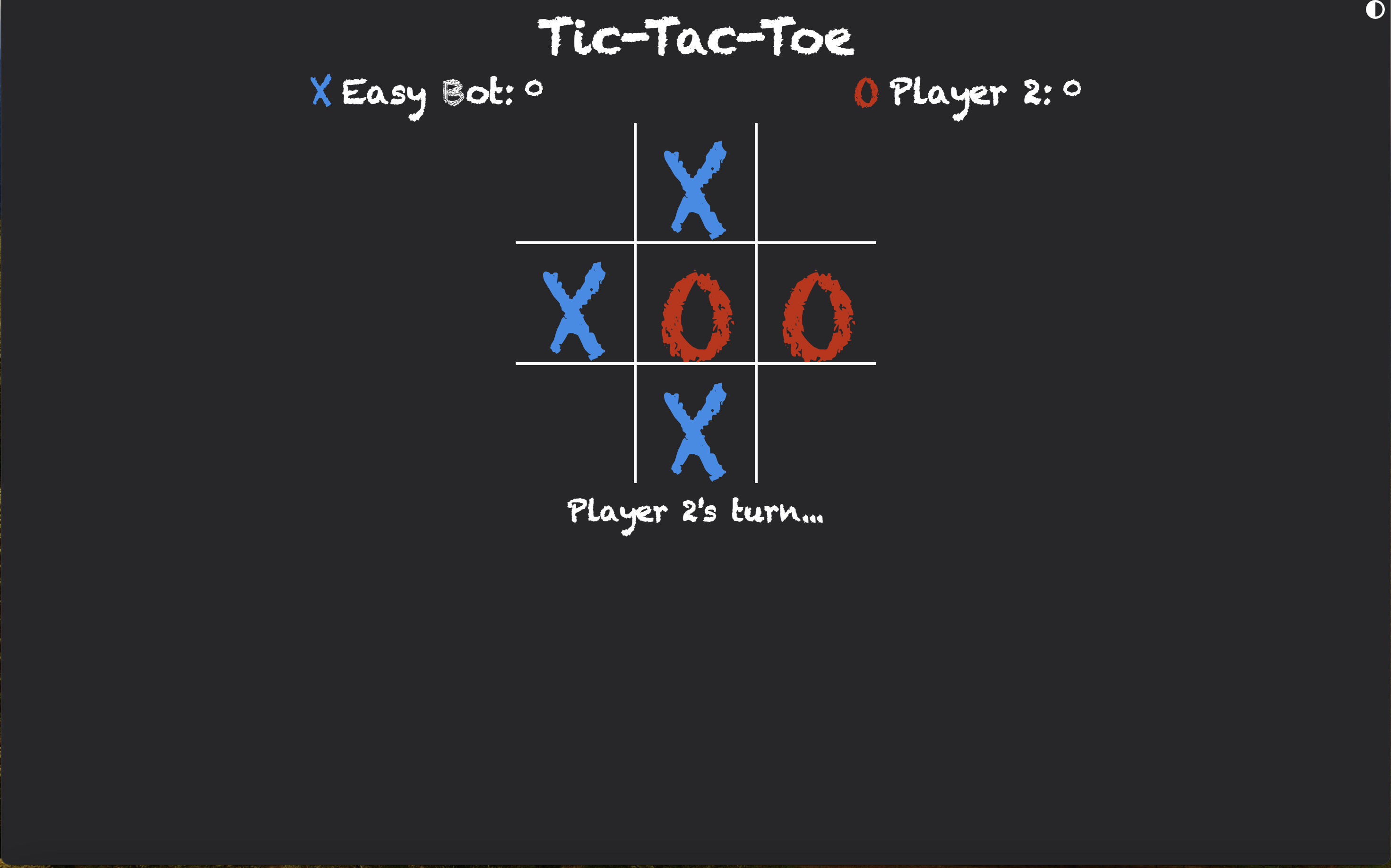 I first only implemented a player vs player game, but decided to challenge myself by adding the option of challenging a bot. There are three levels of difficulty available, which are as follows: