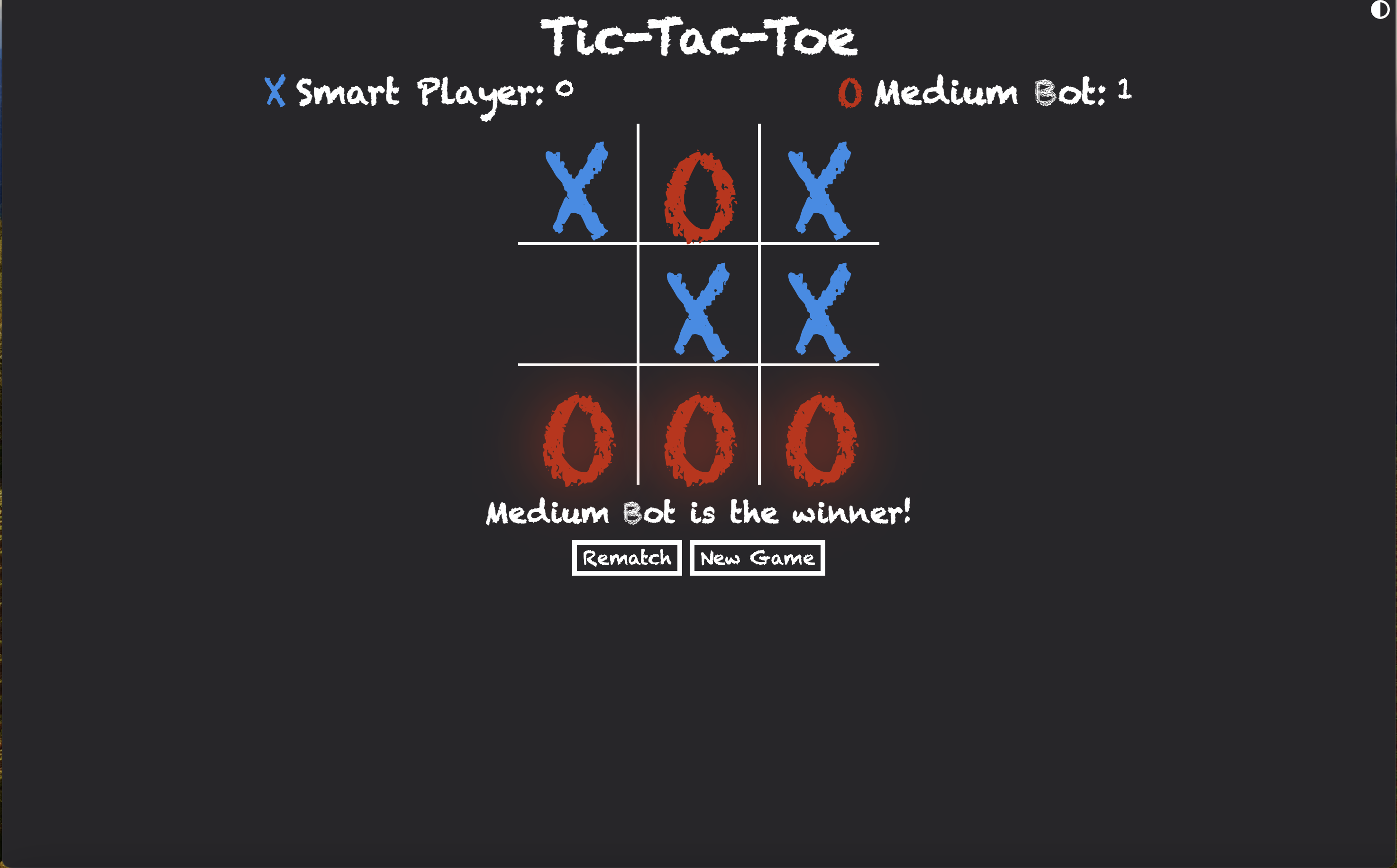 Medium - After successfully implementing the minimax algorithm, the idea for a medium level came naturally. Instead of a bot that views all possibilities and making the best decision possible (assuming the player also tries to choose the best moves), this bot would only consider the consequences of their move for the immediate next turn.