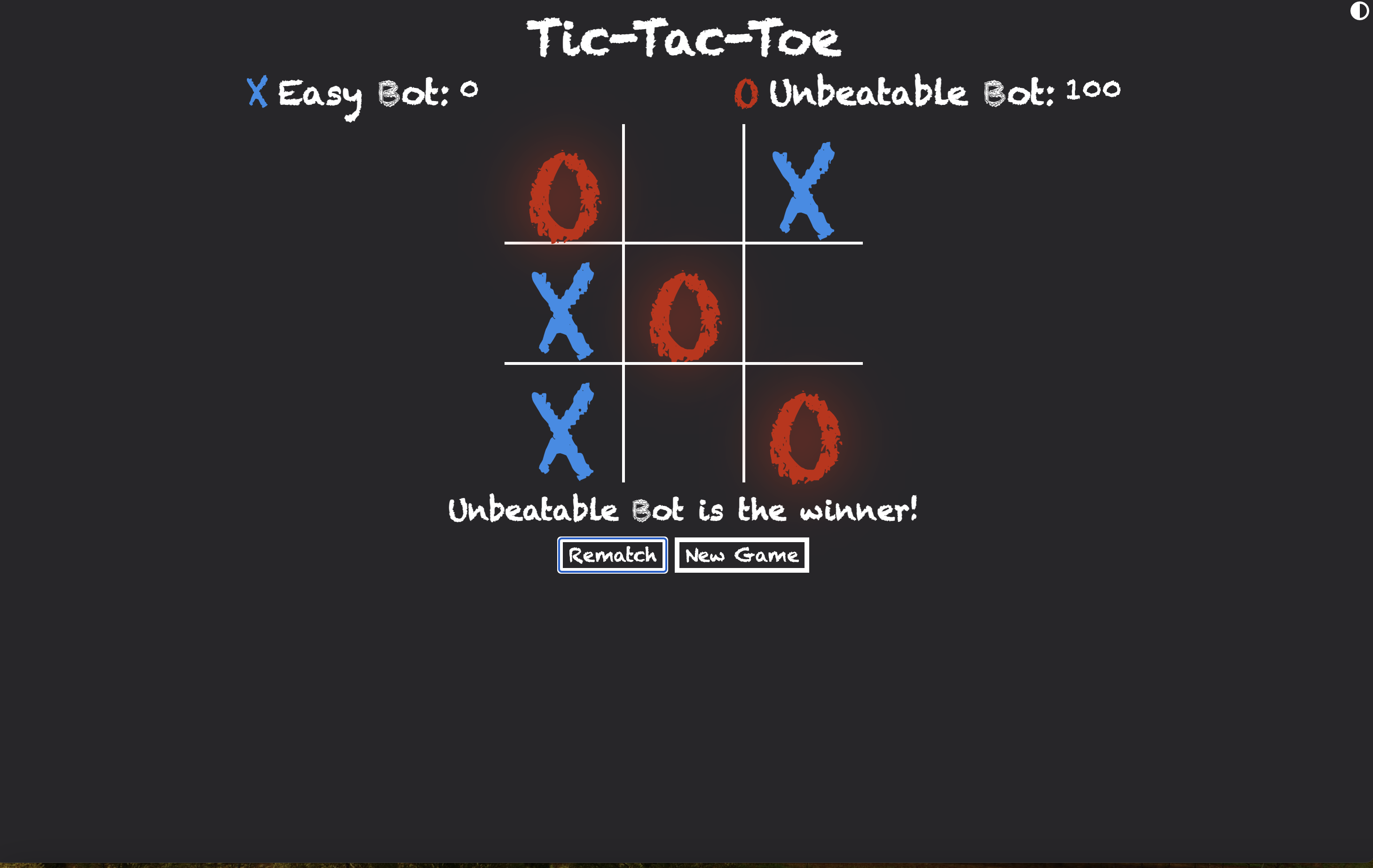 Unbeatable - This is where I spent the bulk of the time on the project as I found it difficult to implement the minimax algorithm. I learned better coding practices after a string of failed attempts, taking a break to test my understanding of the algorithm before starting from scratch and attempting it again. In the final implementation, I decided to have the bot pick a random move if it starts first, in order to create more variations in game rounds.